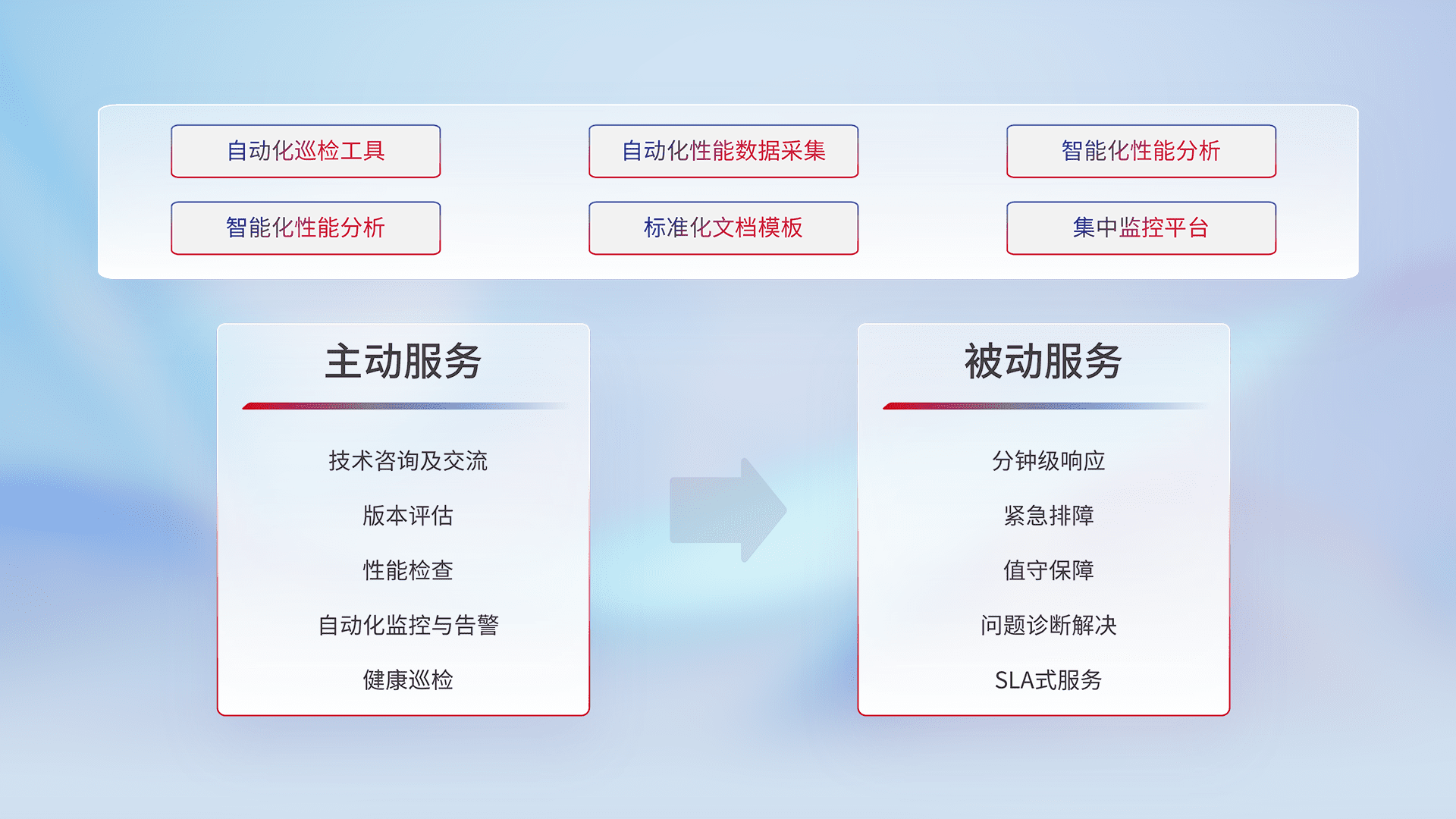 智能化工具和标准化文档,,,保障服务质量,,,,提供主动服务(包含技术咨询、、、、版本评估、、、性能检查、、自动化监控与告警、、、、健康巡检)和被动服务包含(分钟级响应、、、紧急排障、、值守保障、、问题诊断解决、、、、SLA服务)。。。。